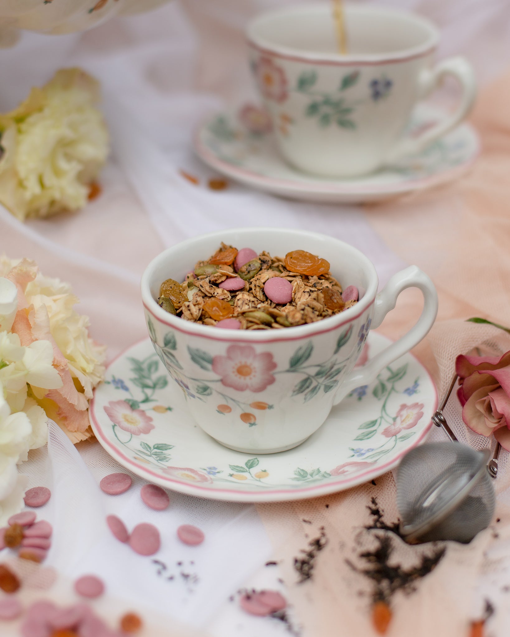 Organic Rolled Oats*, Organic Grade A Maple Syrup, Dark Brown Sugar, Callebaut Ruby Chocolate, Organic Sultans, Earl Grey Tea Leaves, Sliced Almonds, Pumpkin Seeds, Sea Salt, Sunflower Oil